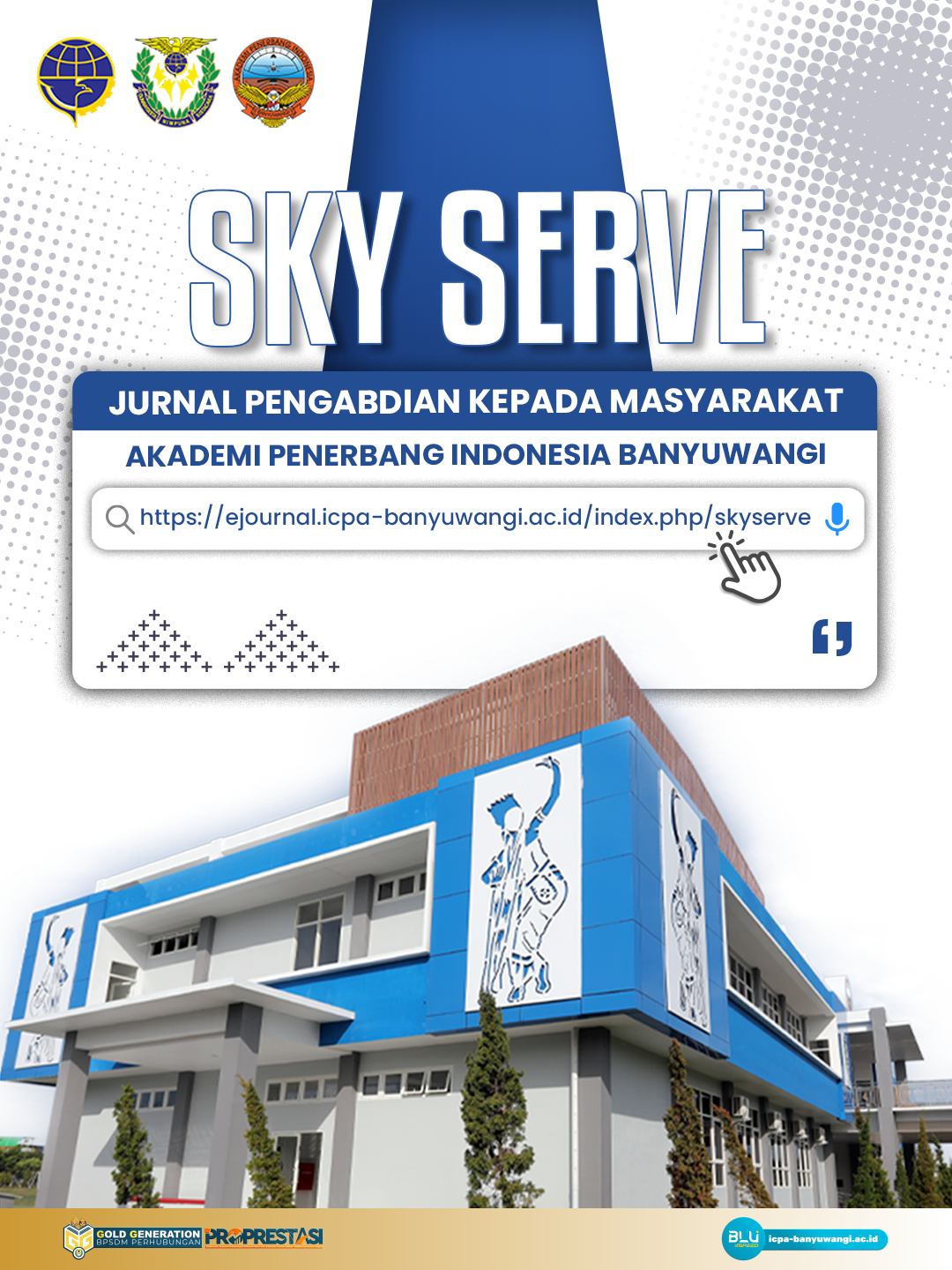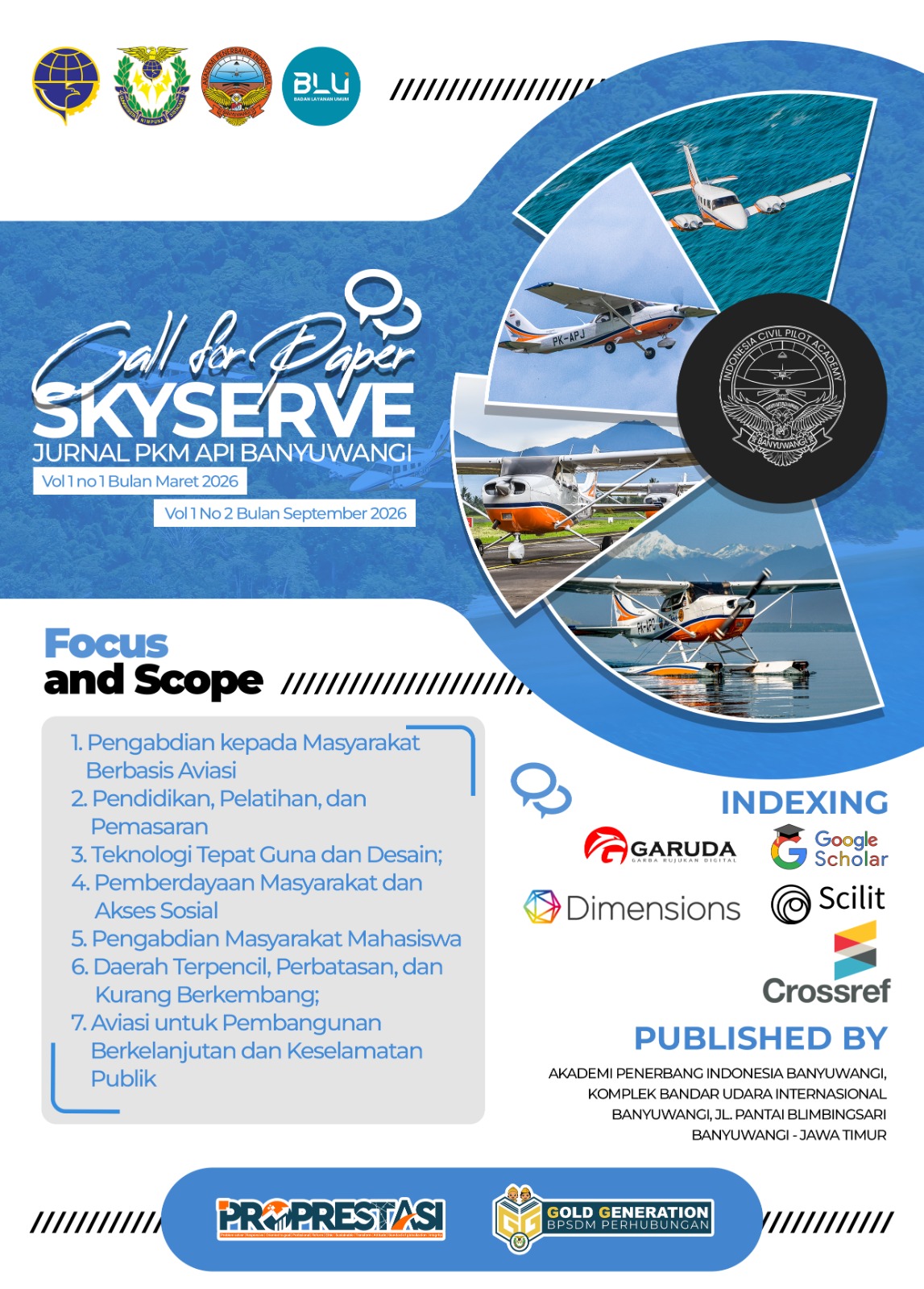 SKYSERVE : Jurnal Pengabdian Kepada Masyarakat mempublikasikan karya ilmiah hasil kegiatan pengabdian kepada masyarakat di bidang aviasi, dengan fokus pada edukasi dan pelatihan penerbangan, manajemen dan operasional kebandarudaraan, keselamatan dan hukum penerbangan, pengembangan sumber daya manusia transportasi, serta inovasi pembelajaran dan penerapan teknologi tepat guna.